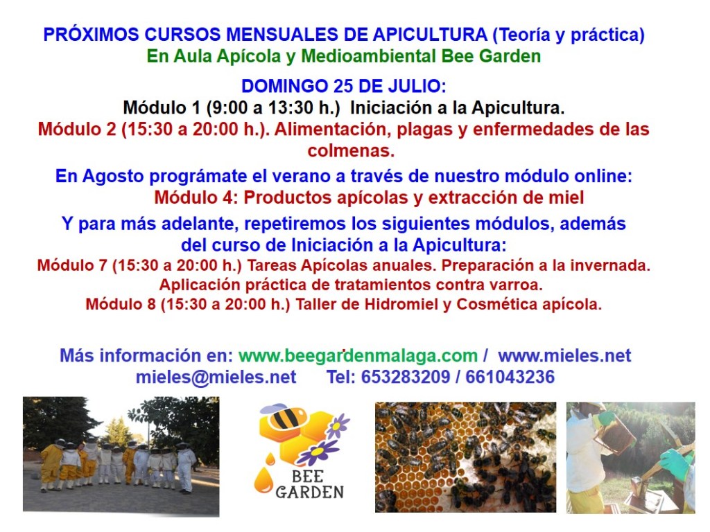Módulo 1 (10:30 a 13:00 h.) Iniciación a la Apicultura. Prácticas en el colmenar educativo y de investigación Bee Garden. Teoría durante las prácticas y a través de manual en pdf.