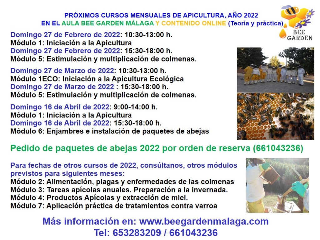 Módulo 2 (15:30 a 18:00 h.) Alimentación, plagas y enfermedades de las abejas. Prácticas en el colmenar educativo y de investigación Bee Garden. Teoría durante las prácticas y a través de manual en pdf.