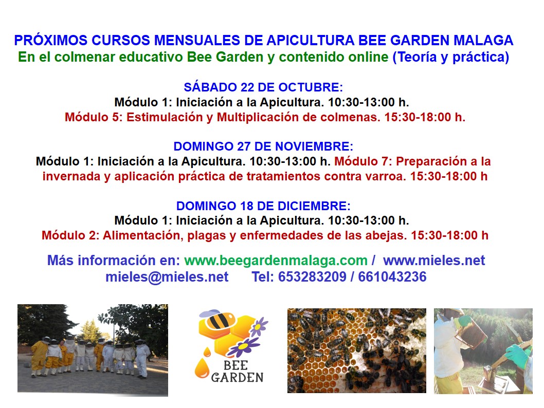 Módulo 1 (10:30 a 13:00 h.) Iniciación a la Apicultura. Prácticas en el colmenar educativo y de investigación Bee Garden. Prácticas en el colmenar educativo y de investigación Bee Garden. Teoría online vía Zoom, Youtube y día de las prácticas.